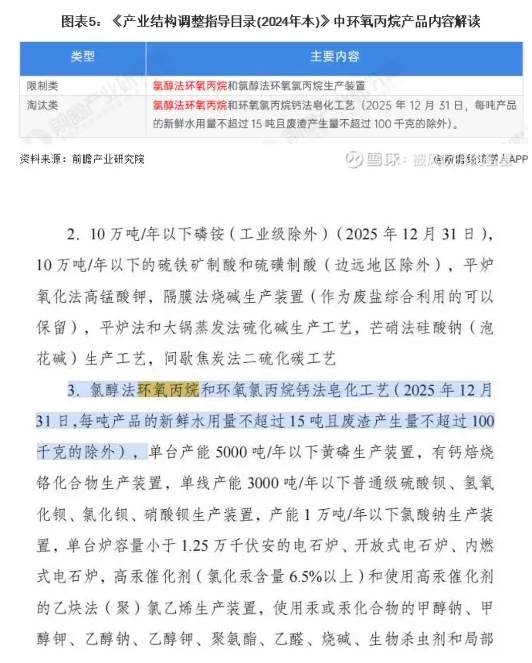 在《產業結構調整指導目錄(2024年本)》中將“氯醇法環氧丙烷/環氧氯丙烷鈣法皂化工藝(2025年12月31日,每噸產品的新鮮水用量不超過15噸且廢渣產生量不超過100千克的除外)”列為淘汰類。