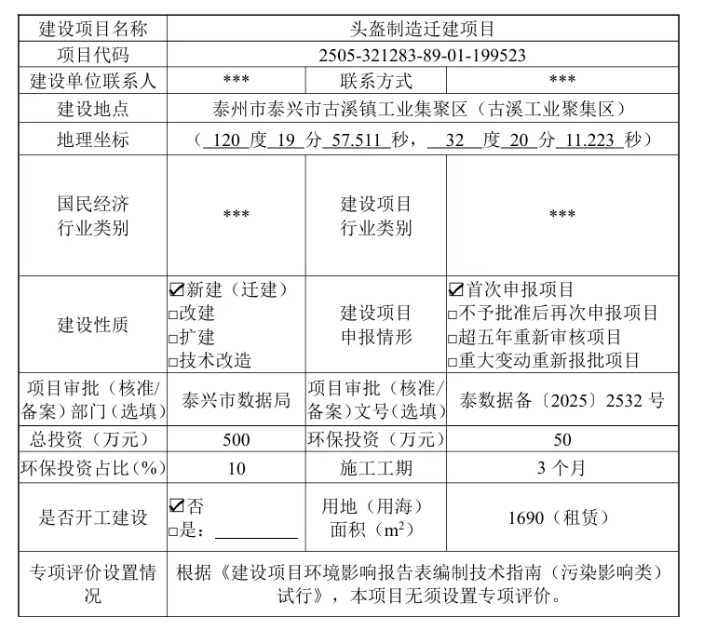 項目建成后,形成年產摩托車頭盔20萬個、電動車頭盔5萬個的生產能力。本項目勞動定員40人,年工作300天,晝間兩班制,每班工作8小時,不設食堂及住宿。本項目已于2025年5月16日在泰興市數據局取得備案,項目代碼:2505-321283-89-01-199523.備案證號:泰數據備〔2025〕2532號。