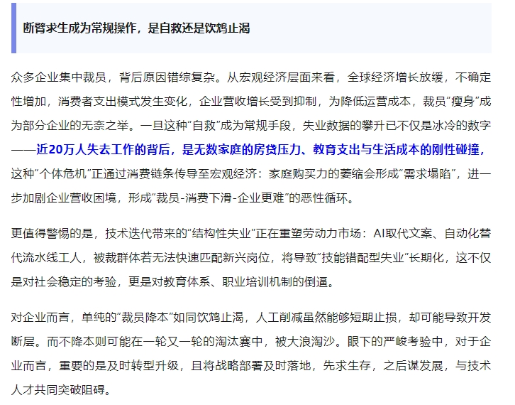 今年以來,國內(nèi)和海外的多家知名企業(yè)都進行了不同規(guī)模的裁員,涉及科技、零售、物流、運輸?shù)榷鄠€行業(yè)領(lǐng)域,裁員人數(shù)更是動輒上千,僅2025年以來的裁員就接近了20萬人。