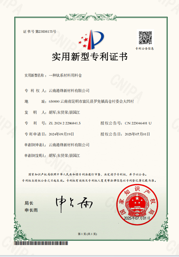 近日,泛華化學旗下全資子公司云南港烽新材料有限公司傳來喜訊,其提交的“一種鈦系材料用料倉”發(fā)明專利申請,成功獲得國家知識產權局授權(專利號:ZL202422286841.5 )。