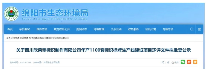 近日,綿陽市生態環境局發布關于四川欣榮奎標識制作有限公司年產1100套標識標牌生產線建設項目環評文件擬批復公示。