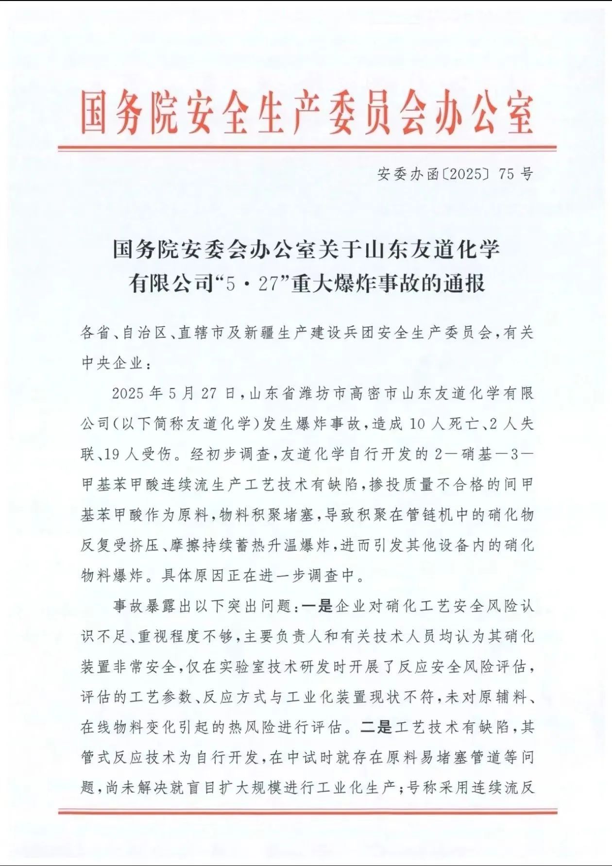 近日,國務院安委會辦公室發布關于山東友道化學有限公司“5?27”重大爆炸事故的通報。5月27日,該企業發生爆炸事故,造成10人死亡、2人失聯、19人受傷。初步調查顯示,事故因企業自行開發的生產工藝技術有缺陷,且使用不合格原料,導致物料積聚堵塞引發爆炸,具體原因仍在進一步調查中。
