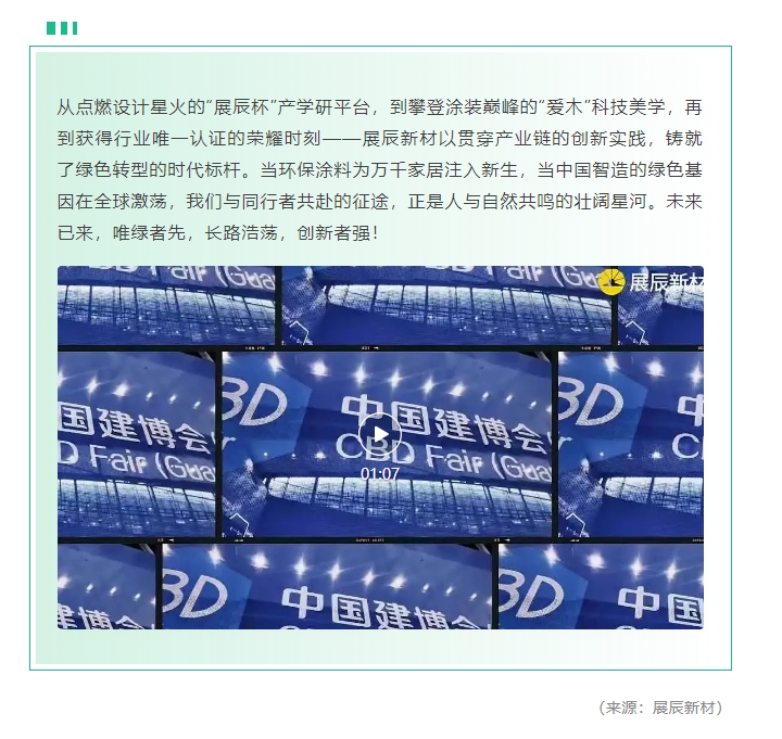在“紀念綠水青山就是金山銀山理念提出20周年暨新時代家居發展座談會”上,展辰新材榮獲多項重磅榮譽:作為中國涂料行業唯一代表獲授“生態友好型企業”稱號;董事長陳冰榮膺中國涂料行業唯一“中國環保家居領袖人物”;營銷總經理楊求貴當選“中國環保家居領軍人物”;以唯一專業木器涂料品牌榮登“第五屆2025中國家居綜合實力100強品牌”榜單。