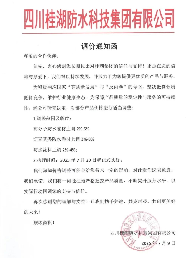 阿爾法新材料江蘇發布調價函,稱為保障品牌可持續發展、規范市場秩序并維護良性競爭環境同時切實守護客戶長期權益,經審慎研究,7月15日起,防水卷材上調1%-5%,防水涂料上調3%-10%,防水堵漏上調5%-10%。