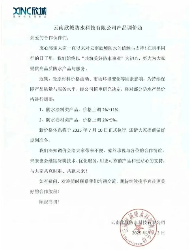 云南欣城防水科技發布產品調價函,受原材料價格波動、市場環境變化等因素影響,為持續保障產品質量與服務水平,經慎重研究決定,7月20日起,防水涂料類產品價格上調2%-11%,防水卷材類產品價格上調2%-5%。