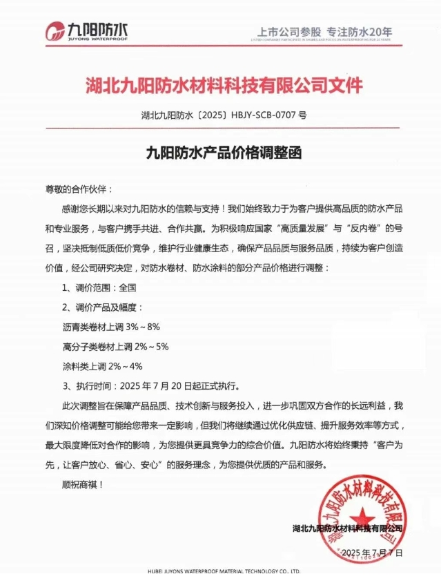 九陽防水發布產品價格調整函,對防水卷材、防水涂料的部分產品價格進行調整:7月20日起,瀝青類卷材上調3%-8%,高分子類卷材上調2%-5%,涂料類上調2%-4%。