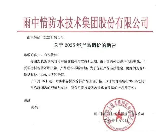 雨中情防水技術集團股份發布調價函告,稱7月15日起,對防水卷材及涂料產品上調價格,預計漲價幅度在3%-5%之間。