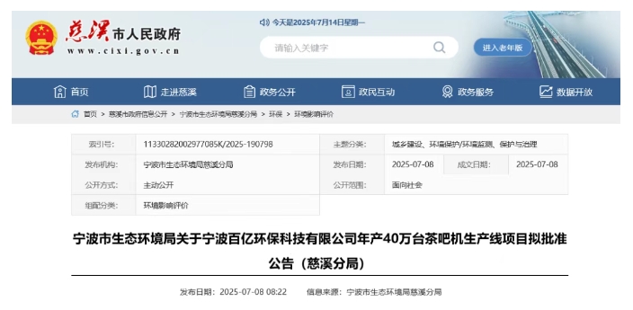 寧波市生態(tài)環(huán)境局發(fā)布關(guān)于寧波百億環(huán)保科技有限公司年產(chǎn)40萬臺(tái)茶吧機(jī)生產(chǎn)線項(xiàng)目擬批準(zhǔn)公告(慈溪分局)。