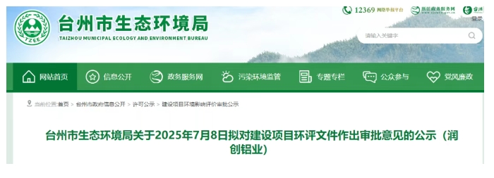 臺州市生態環境局發布關于2025年7月8日擬對建設項目環評文件作出審批意見的公示(潤創鋁業)。