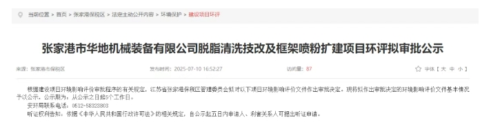 張家港市保稅區發布張家港市華地機械裝備有限公司脫脂清洗技改及框架噴粉擴建項目環評擬審批公示。