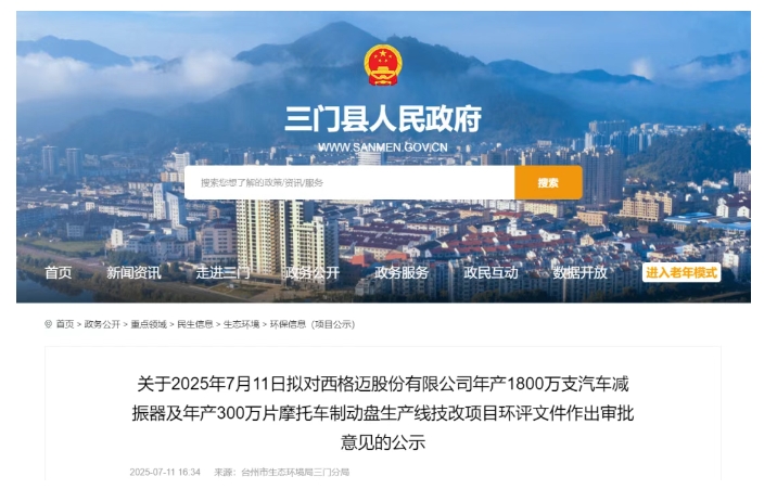 近日,臺州市生態環境局三門分局發布關于2025年7月11日擬對西格邁股份有限公司年產1800萬支汽車減振器及年產300萬片摩托車制動盤生產線技改項目環評文件作出審批意見的公示。