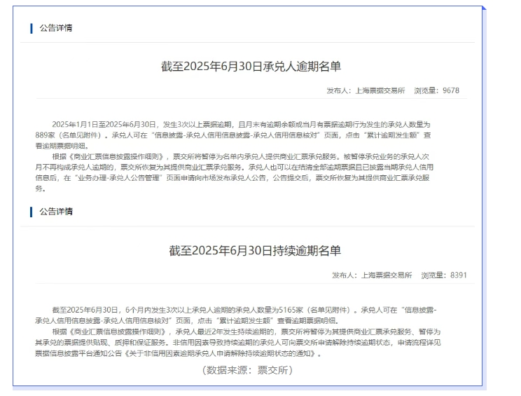 2025年上半年已經結束,票據逾期情況依舊不容樂觀,且有愈演愈烈之勢。根據上海票交所發布的名單,2025年6月承兌人逾期名單上承兌人數量為889家,上海票交所將暫停這889家承兌人的票據承兌功能。6月持續逾期名單上承兌人有5165家,上海票交所將根據名單中的持續逾期開始時間算起,暫停其承兌、貼現、保證、質押等功能2年。