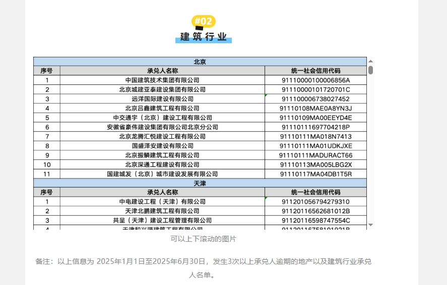 記者統計了 2025年1月1日至2025年6月30日,發生3次以上承兌人逾期的地產以及建筑行業承兌人名單,這些曾經風光無限的企業,如今卻淪為被人指指點點,或將走向倒閉之路的“危樓”。