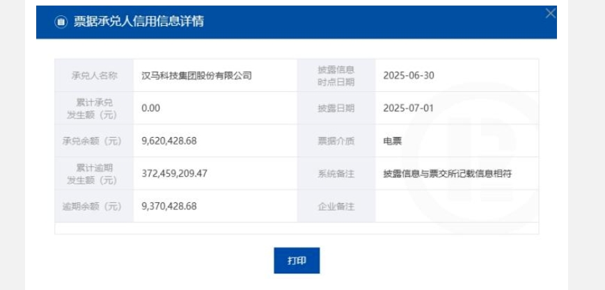 截至 6月30日,吉利集團旗下子公司漢馬科技逾期余額為937.04萬元, 累計逾期發生額達 3.72億元。票交所已暫停其商業匯票承兌服務權限,企業須清償全部逾期票據并完成信用修復流程后方可申請恢復。
