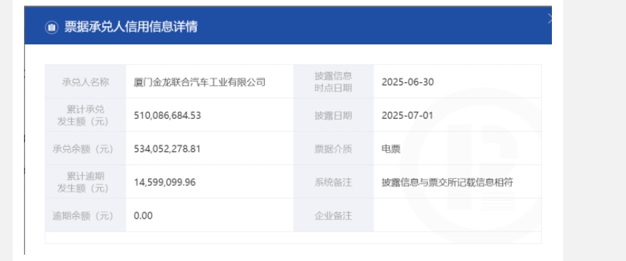 2025年上半年,廈門金龍的累計承兌發生額達到5.1億元,承兌余額為5.34億元, 而累計逾期發生額則為 1459.9萬元。上海票交所已暫停該公司的商業匯票承兌服務權限。