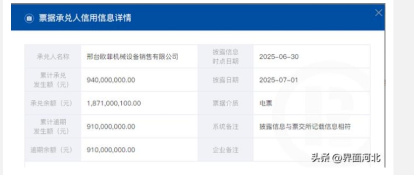工程機械領域, 截至 2025年6月30日,邢臺歐菲機械累計逾期發生額為9.1億元, 逾期余額為 9.1億元。