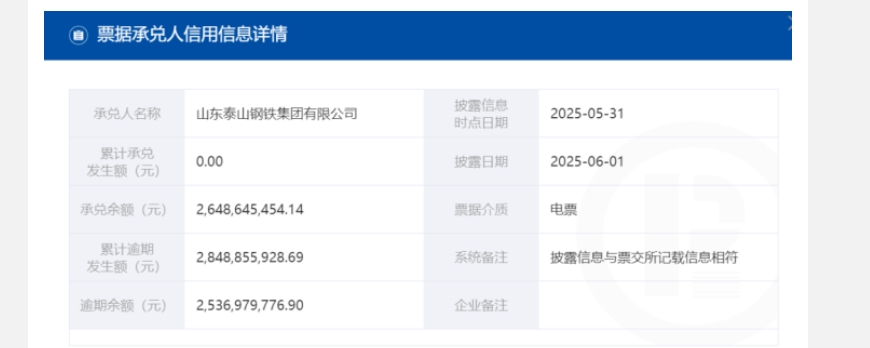 鋼鐵行業,知名企業山東泰山鋼鐵不幸 “淪陷”。 截止 2025年6月1日,山東泰山鋼鐵集團有限公司的商業 承兌匯票逾期余額已達 25.36億元,承兌余額為 26.48億元。