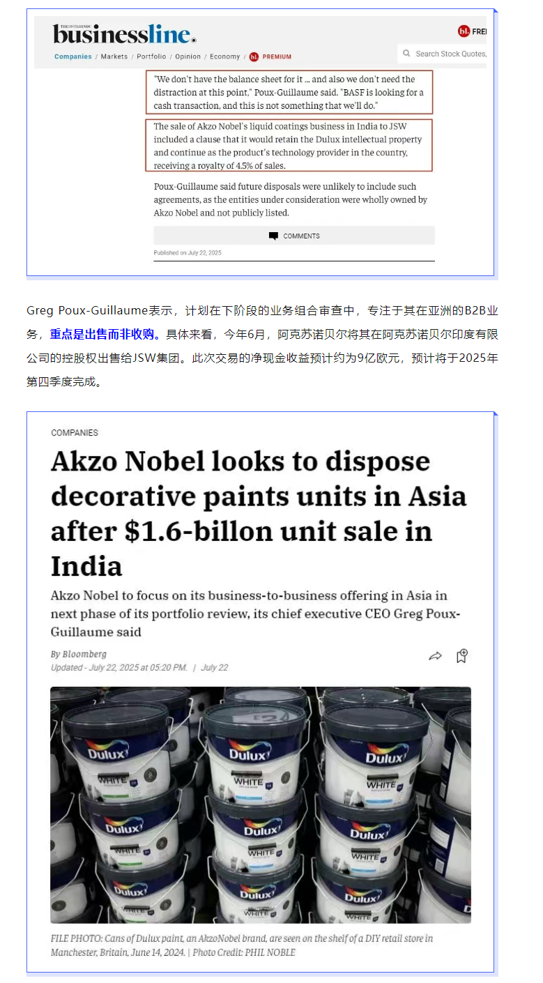 近日,外資涂料巨頭巴斯夫剝離涂料業(yè)務(wù)一事再起波瀾,據(jù)路透社報(bào)道,阿克蘇諾貝爾首席執(zhí)行官Greg Poux-Guillaume被問及“考慮收購(gòu)巴斯夫的涂料業(yè)務(wù)”時(shí)指出,“阿克蘇諾貝爾尚未承諾進(jìn)行任何這樣的程序。”其還表示“我們沒有這方面的資產(chǎn)負(fù)債表……而且我們現(xiàn)在不需要分心……巴斯夫正在尋求現(xiàn)金交易,而我們不會(huì)這么做。”這似乎體現(xiàn)出了阿克蘇諾貝爾對(duì)于收購(gòu)巴斯夫涂料業(yè)務(wù)的“婉拒”態(tài)度。