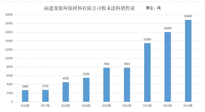 根據榜單,福建龍朋環保材料有限公司近十年銷售量均呈上升趨勢,2024年最新數據相較于2023年同比增長17.5%。回顧近10看看發展情況,2015年,龍朋環保的粉末涂料銷量僅為2688噸,而到了2024年,粉末涂料的銷量為18800噸,火箭式增長599%。