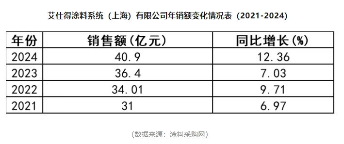 另?yè)?jù)涂料采購(gòu)網(wǎng)披露的數(shù)據(jù),2024年艾仕得涂料系統(tǒng)(上海)有限公司實(shí)現(xiàn)銷售額40.9億元人民幣,不僅刷新歷史最高紀(jì)錄,更以12.36%的同比增速創(chuàng)下近四年新高。這一表現(xiàn)遠(yuǎn)超2023年7.03%的增長(zhǎng)率,展現(xiàn)出強(qiáng)勁的增長(zhǎng)勢(shì)頭。