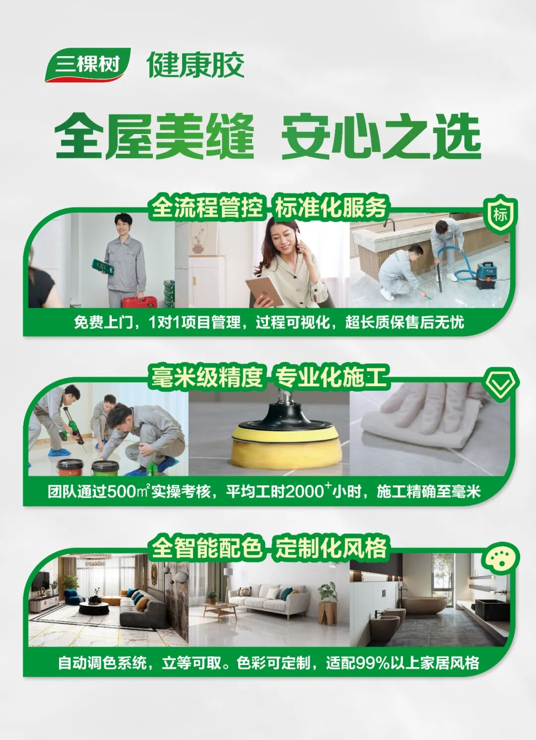 傳統美縫市場常面臨“產品適配難、施工無標準、售后無保障”的痛點,三棵樹以“全屋美縫”為核心,打造從產品到體驗的全鏈條解決方案,徹底重構美縫消費體驗。