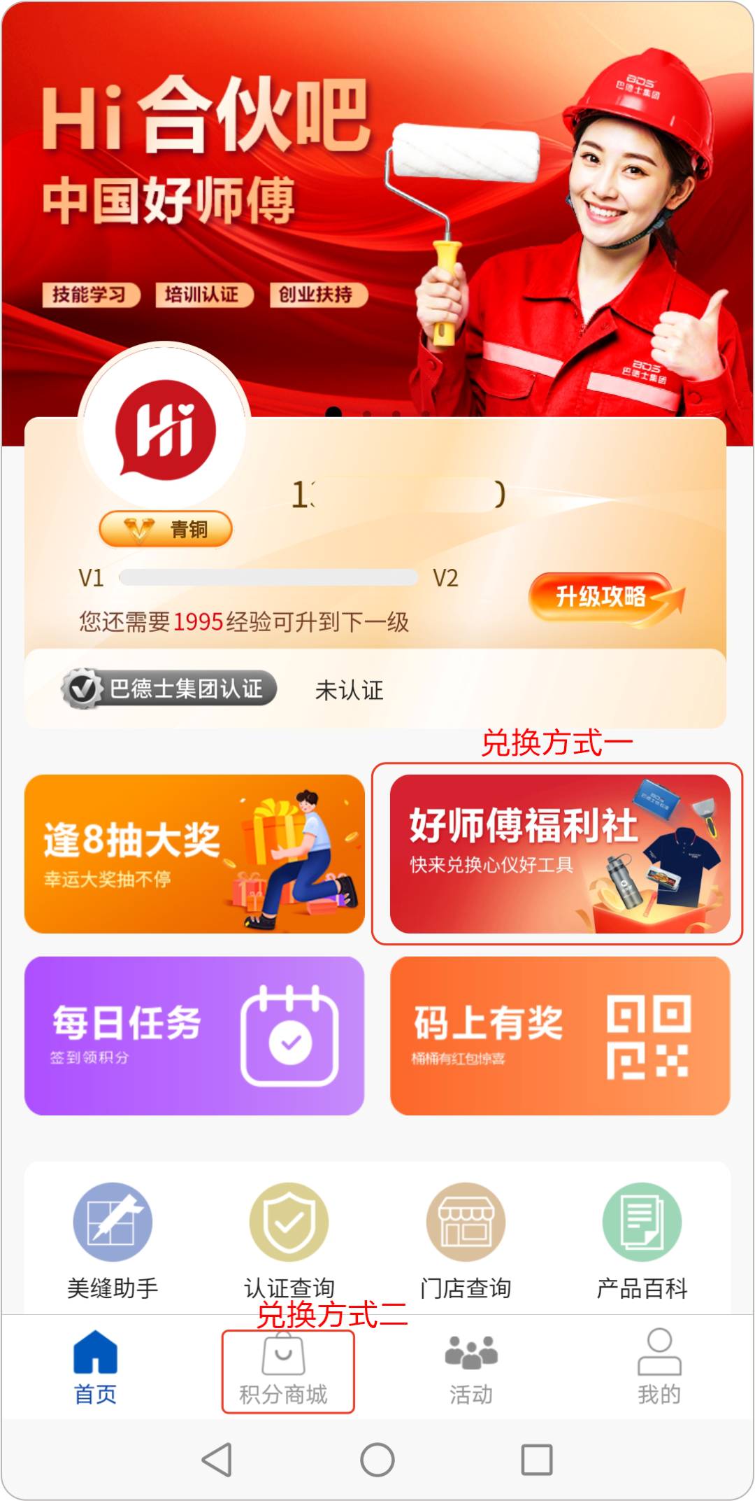 直接在首頁【好師傅福利社】進(jìn)行兌換,兌換巴德士專業(yè)裝修工具及精選禮品,每月底統(tǒng)一配送至當(dāng)?shù)亻T店,會員需到門店自提。