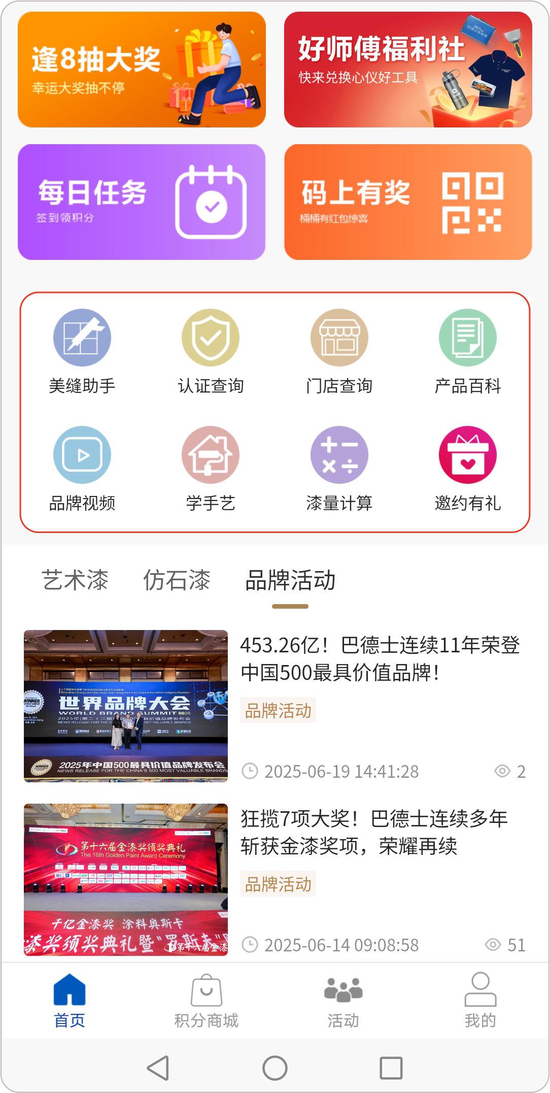 培訓(xùn)認(rèn)證:在首頁點(diǎn)擊“美縫助手”、“學(xué)手藝”、“漆量計算”等實用工具,即可一鍵跳轉(zhuǎn),輕松學(xué)習(xí)施工技巧、產(chǎn)品知識及實操技能;線下還會舉辦培訓(xùn)、競賽兩類培訓(xùn)活動,為會員提供專業(yè)學(xué)習(xí)機(jī)會,并發(fā)放證書。