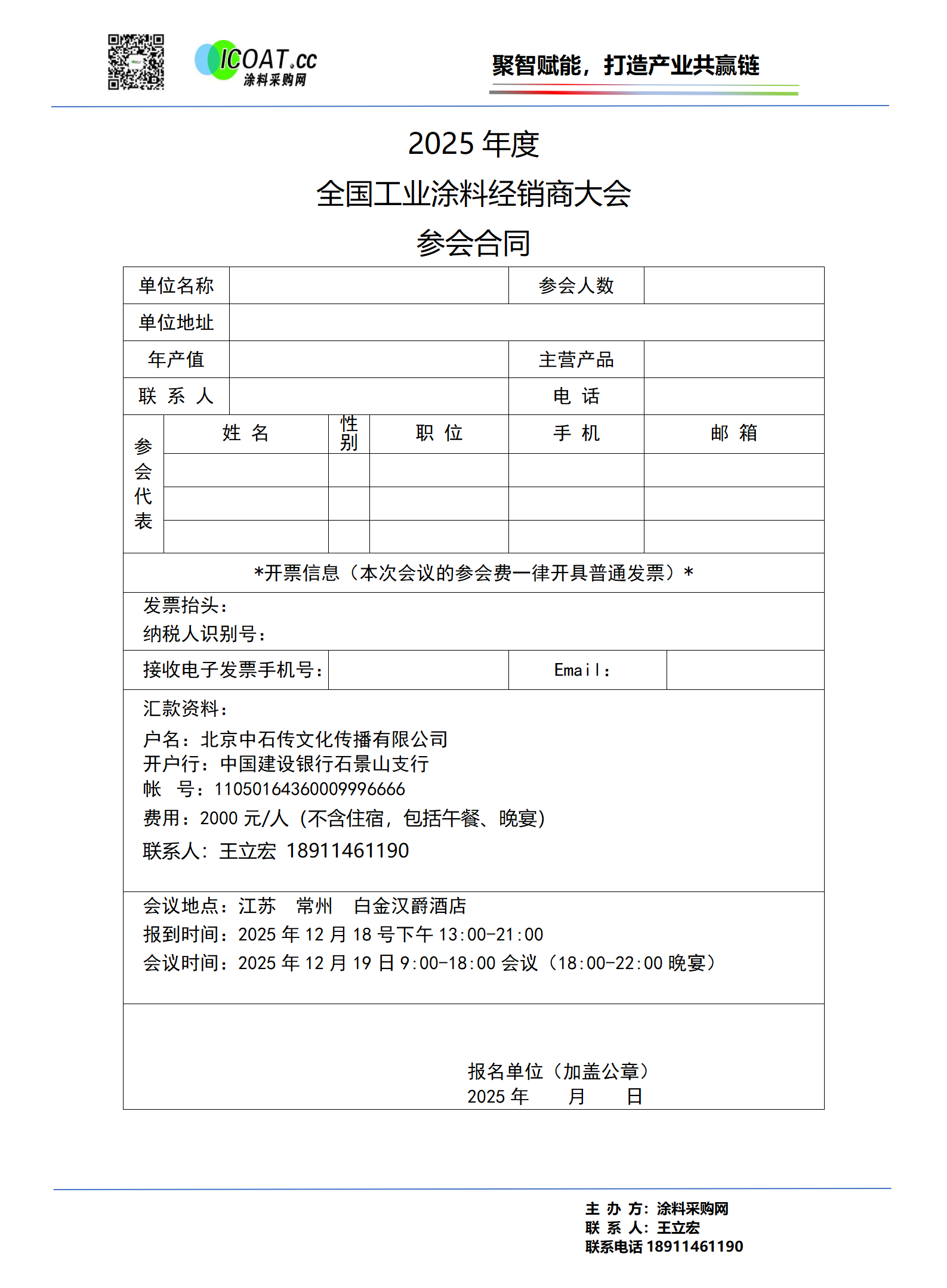 面對目前涂料上下游產業的嚴重內卷,距離涂料行業踐行高質量發展的目標越來越遠。涂料采購網誠邀各大涂料油漆、水性工業漆企業、全國各大經銷商和代理商、施工企業、終端用戶、上游原材料及設備企業、涂裝等頭部企業于2025年12月18 日-19日共赴江蘇常州共同舉辦以“聚焦產業賦能 高質量發展”為主題的“2025年全國工業漆經銷商全產業鏈交流大會”,與涂料行業全產業鏈龍頭企業共同深入探討涂料全產業鏈的創新、綠色發展,推進產業集聚,強化品牌建設,實現涂料行業的高端化、綠色化、智能化發展。