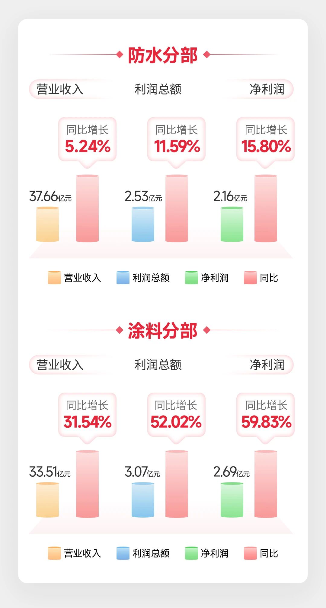 “兩翼”業(yè)務方面,防水業(yè)務營業(yè)收入37.66億元,同比增長5.24%;利潤總額2.53億元,同比增長11.59%;凈利潤2.16億元,同比增長15.80%。涂料業(yè)務營業(yè)收入33.51億元,同比增長31.54%;利潤總額3.07億元,同比增長52.02%;凈利潤2.69億元,同比增長59.83%,“兩翼”業(yè)務收入、利潤實現(xiàn)逆勢增長,業(yè)務規(guī)模與貢獻度有效提升,為北新建材整體經(jīng)營注入強勁動能。