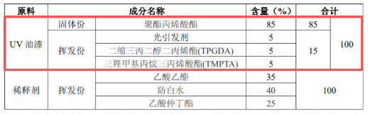 UV漆:項目油漆為UV漆;外觀為粘稠性液體;具有刺激性氣味;油漆密度為1.25g/cm3;主要成分為:聚酯丙烯酸酯80%~95%;二縮三丙二醇二丙烯酯(TPGDA)1%~5%;三羥甲基丙烷三丙烯酸酯(TMPTA)1%~5%;光引發(fā)劑0%~5%。不溶于水,可與丙酮、醋酸正丁酯等酮和酯類溶劑混溶。