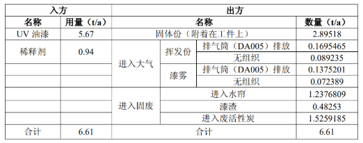 油漆、稀釋劑消耗量核算: 本項目使用的油漆為UV光固化漆。UV光固化漆使用時需添加稀釋劑進行稀釋后方可使用;油漆與稀釋劑的比例為6:1(重量比);油漆密度約為1.25g/cm3. 揮發(fā)份含量為15%,稀釋劑密度為0.86g/cm3.揮發(fā)份含量為100%。