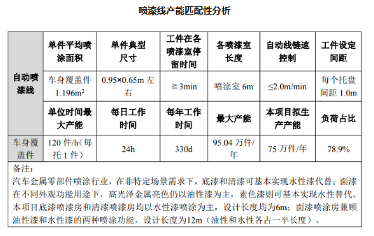 項目噴漆為產品—自動線噴漆線。根據《噴漆工序有機廢氣源強的估算比較》 可知,電泳涂裝效率為 95%以上;根據參照《汽車工業污染防治可行技術指南》(HJ1181-2021): 表 9“采用電泳超濾技術可使電泳材料利用率達到98%以上”,保守起見本項目電泳浸涂效率取95%。 參考《廣東省表面涂裝汽車制造業)揮發性有機廢氣治理技術指南》(粵環 (2015)4 號)中2.1.3 涂裝技術可知,靜電噴涂涂料利用率約為60~70%,保守起見本次評價取 60%。