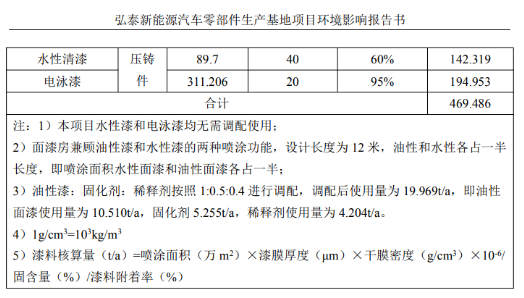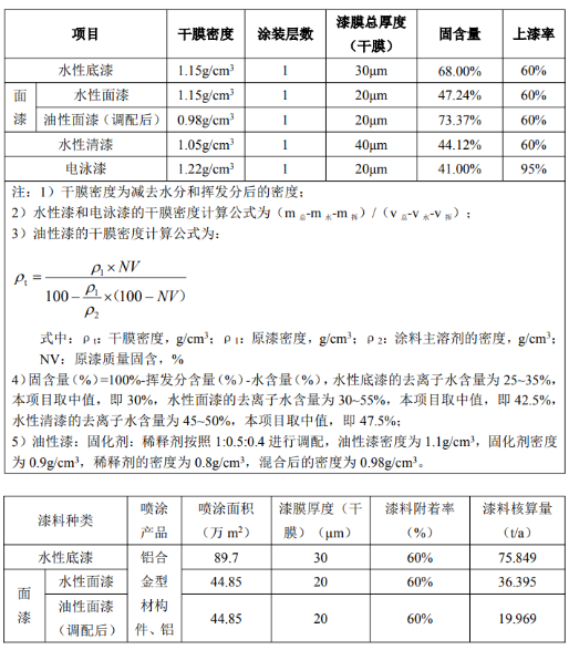 油漆用量核算 根據建設單位提供資料,項目需噴漆產品為89.700萬m2、噴粉產品為669.874萬m2、電泳產品為311.206萬m2.根據建設單位提供資料,本項目水性底漆、面漆、清漆和電泳漆均無需調配 使用。油性面漆需要調配后使用,油性漆:固化劑:稀釋劑的比例為1:0.5:0.4. 本項目噴漆產品涂裝為1層底漆+1層面漆+1層清漆,底漆漆層厚度為15μm、 面漆漆層厚度為20μm、清漆漆層厚度為30μm;電泳漆1層,漆層厚度為20μm。