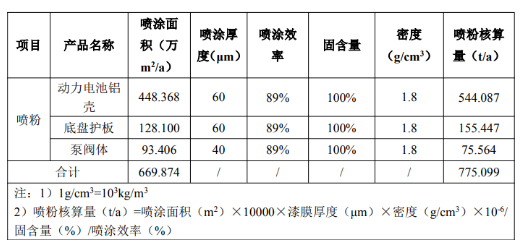 由上表計算結果可知,本項目熱固性粉末涂料用量為775.099t/a,本次評價 以熱固性粉末涂料用量775.099t/a,對污染物產排情況進行核算。 綜上,涂料使用量根據計算公式計算,經工程分析可知,本項目涂料的理論用量與企業提供的各漆種用量基本吻合,本環評污染源廢氣產排情況計算以核算用量為準。