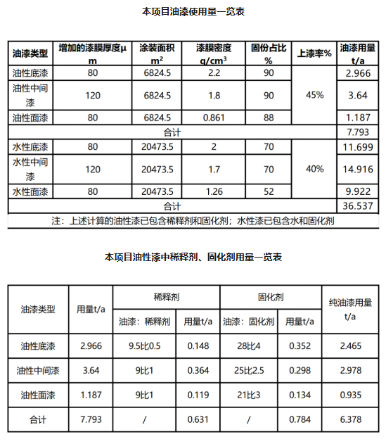 本次技改項目噴涂對象為運輸機零部件(部分框架),其單套框架噴涂面積約為13.649m2;約有2000套需要噴漆(其中:約25%噴油性漆;約75%噴水性漆);則油性漆噴涂總面積為6824.5m2;水性漆噴涂總面積為20473.5m2.