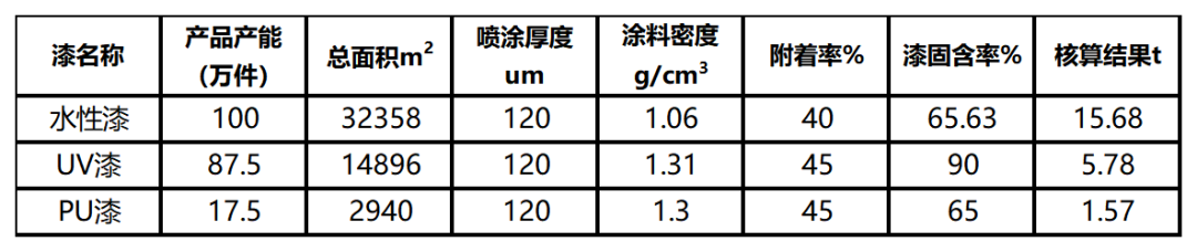 根據建設方提供的資料。水性漆:水性漆稀釋劑:水性漆固化劑用量配比比例為:1:0.3:0.3;UV漆:UV漆稀釋劑:UV漆固化劑用量配比比例為:1:0.12:0.06;PU漆:PU漆稀釋劑:PU漆固化劑用量配比比例為:1:0.2:0.4.據此核算項目涂料使用情況如下。