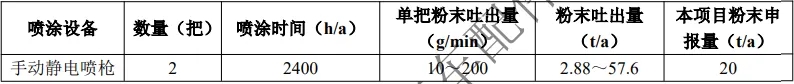 考慮到損耗等情況,本項目按噴涂粉末年用量20t/a申報,滿足項目產(chǎn)品噴涂粉末用量需求。 靜電噴涂生產(chǎn)線產(chǎn)能匹配性分析:本項目不設(shè)置自動噴涂線,故本次不進行涂裝設(shè)備匹配性分析,僅進行涂料用量匹配性分析。 項目配備1臺手動噴粉柜,人工噴粉柜內(nèi)有2個噴粉工位,每個工位配備1把人工噴槍, 兩側(cè)各1把,合計2把人工噴槍。根據(jù)(“4+2”重點行業(yè)指南):佛山市鋁型材涉表面處理建設(shè)項目環(huán)評文件編制技術(shù)參考指南(試行),進行涂料用量匹配性分析:根據(jù)噴 涂設(shè)備供漆量、數(shù)量、噴漆時間校核涂料用量的匹配性。