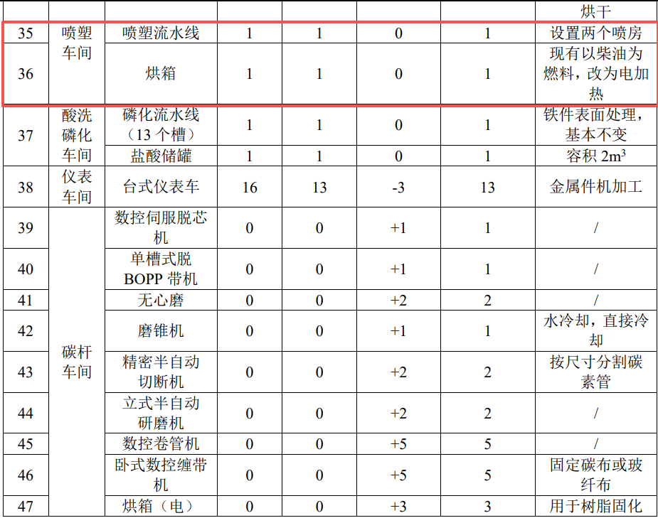 ③新增碳素管(運動杖零件)生產(chǎn)。對應(yīng)產(chǎn)品其它生產(chǎn)工藝不變。同步新增設(shè)備包括熱熔膠涂膠機(jī)、數(shù)控伺服脫芯機(jī)、單槽式脫BOPP帶機(jī)無心磨、磨錐機(jī)、精密半自動切斷機(jī)、立式半自動研磨機(jī)、數(shù)控卷管機(jī)、臥式數(shù)控纏帶機(jī)、注塑機(jī)等。