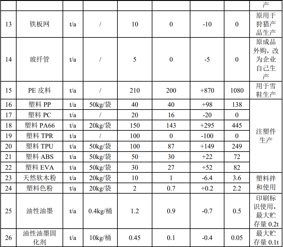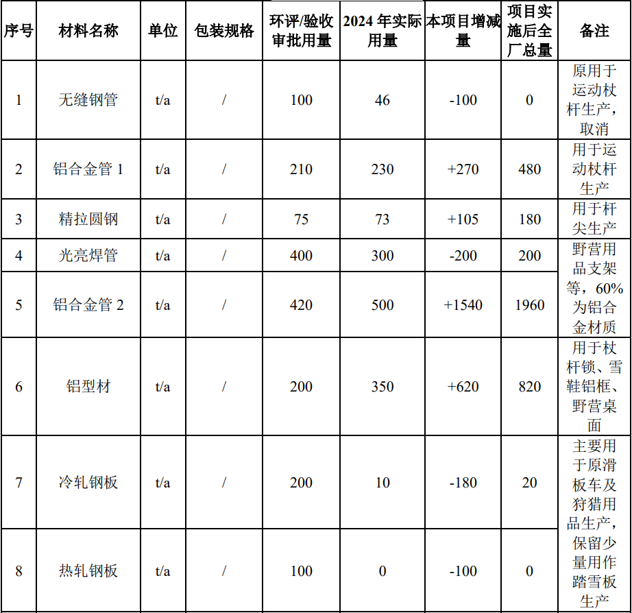 (2)產(chǎn)能調(diào)整:增加運動杖、雪地行走鞋、戶外野營用品生產(chǎn)產(chǎn)能,其中運動 杖由100萬對/年擴(kuò)產(chǎn)到250萬對/年、雪地行走鞋由30萬雙/年擴(kuò)產(chǎn)到100萬雙/年、 戶外野營用品由50萬套/年擴(kuò)產(chǎn)到150萬套/年。