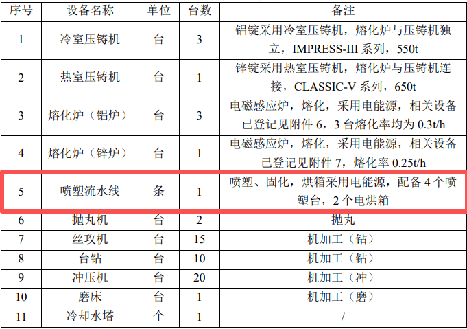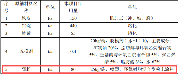 噴塑、固化:根據客戶需求,部分組件表面需進行噴塑處理。將壓鑄 好的組件放入噴臺進行噴塑處理,噴臺主要由噴槍、房體、自動回收系統和 供粉系統組成。供粉系統把壓縮空氣與粉筒內的粉末充分混合后成為流體狀 并通過粉泵輸送到噴槍中。噴槍的槍體內帶有高壓發生器,它可以在槍尖處產生高達10萬伏的電壓,將槍尖附近區域的空氣電離,從噴槍中噴出的粉體 通過該電離區域時帶上負電荷,通過電場力的作用粉末被吸附到接地的工件表面,并形成一層厚度約50~60um 的粉膜;在半密閉的噴塑臺內,風機產生負壓,將噴塑室內未吸附在工件表面的粉體吸入自動回收系統,經過回收系統回收的塑粉重新利用,系統未回收的粉塵向車間逸散,但由于整體的噴塑 車間是密閉車間,逸散的粉塵部分在車間沉降(約70%在車間沉降,該部分塑粉經清掃計入固廢統計),剩余未沉降部分粉塵由工人通過進出車間或產品運 輸帶出排入外環境。噴塑過程會產生噴塑粉塵。