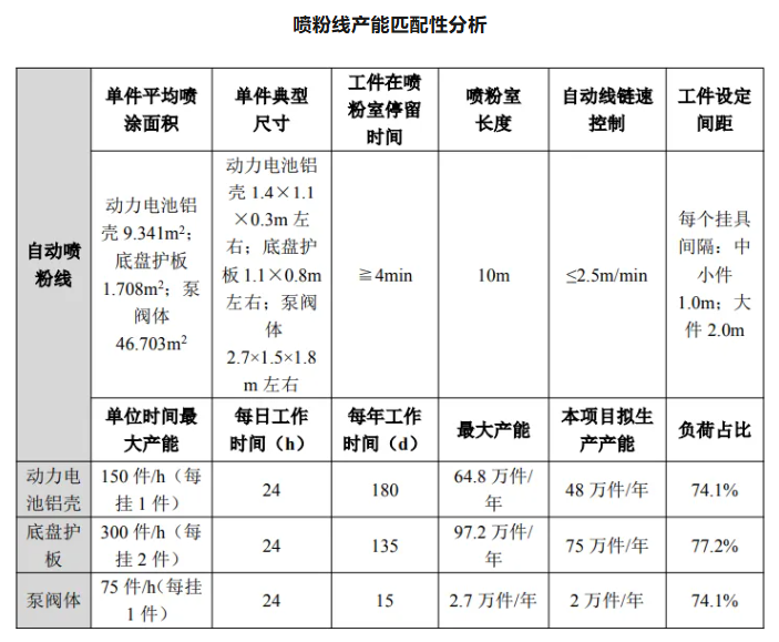 本項目擬設置一條粉末涂裝自動線,自動線中噴粉室設計10m長度,共有16支噴槍分布在噴粉室內,自動控制從不同角度進行噴涂,實現工件表面全覆 蓋涂裝作業。對于新能源汽車零部件的噴粉作業屬于中高精度需求場景,噴粉強度控制在一定范圍以內,可確保覆蓋面積和噴粉量達到設定的要求。根據平均單件噴涂面 積設計掛件在噴粉室中停留時間,再結合噴粉室長度設計情況,確定自動線鏈速控制范圍,最后根據掛件間間距設計分析噴粉生產線的生產能力。需要涂裝工件分配不同工作時間,總工作時間不超過330d,相關參數分析見下表。