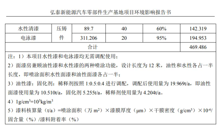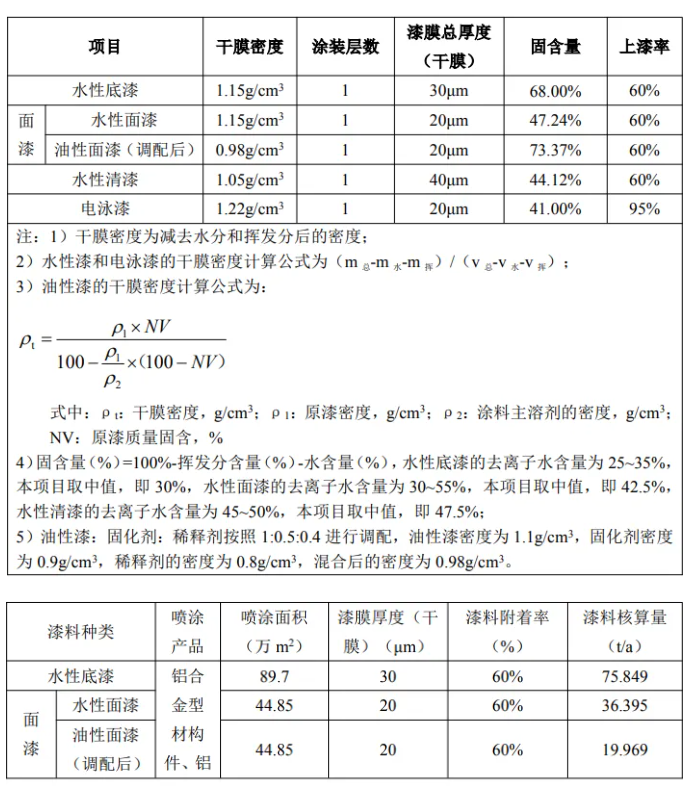 油漆用量核算 根據建設單位提供資料,項目需噴漆產品為89.700萬m2、噴粉產品為669.874萬m2、電泳產品為311.206萬m2.根據建設單位提供資料,本項目水性底漆、面漆、清漆和電泳漆均無需調配 使用。油性面漆需要調配后使用,油性漆:固化劑:稀釋劑的比例為1:0.5:0.4. 本項目噴漆產品涂裝為1層底漆+1層面漆+1層清漆,底漆漆層厚度為15μm、 面漆漆層厚度為20μm、清漆漆層厚度為30μm;電泳漆1層,漆層厚度為20μm。