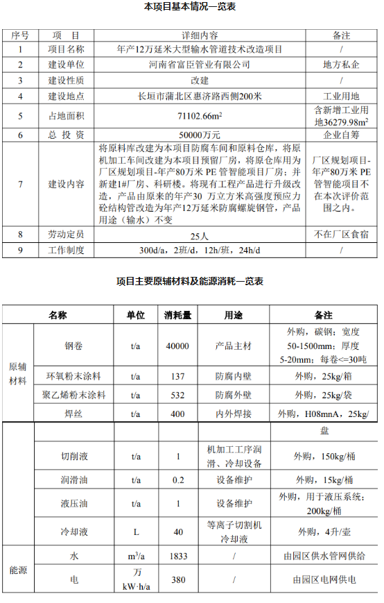 河南省富臣管業有限公司擬投資50000萬元,引入《年 產12萬延米大型輸水管道技術改造項目》對現有工程生產工藝及產品進行升級改 造。項目利用原有及新征用地共計106.65畝,項目利用原有及新建 廠房及配套設施30382.47平方 米,建設年產12萬延米。