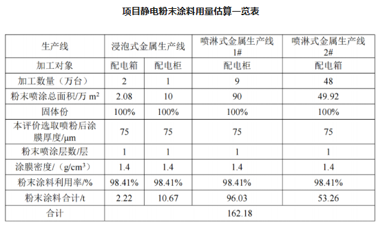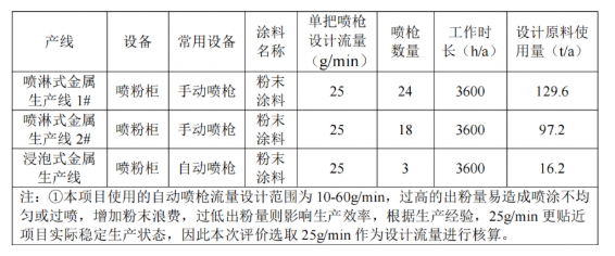 噴槍的粉末輸出量取決于所需的涂層厚度,本項目兩條線所使用的自動噴槍型號相同,數量不同,自動噴槍技術參數見附件10.為保證涂膜厚度一致,根據項目實際生產經驗和自動噴槍技術參數綜合可知,噴淋式金屬生產線1#中每支噴槍設計噴粉量約為 25g/min;噴淋式金屬生產線 2#中每支噴槍設計噴粉量約為25g/min;浸泡式金屬生產線中每支噴槍設計噴粉量約為25g/min。