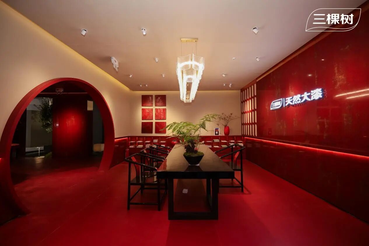 與此同時,三棵樹與覃思老師合作的聯合展廳,以“大漆活化”為核心,打造了3000㎡多品牌綜合展示空間。這里集中呈現大漆在家具、器物與文創中的現代應用,從墻面裝飾到家居配套,皆采用天然大漆制成。作為中國八千年文明的見證,大漆曾與日常生活緊密相連,如今在三棵樹的推動下,正重新回歸大眾視野。