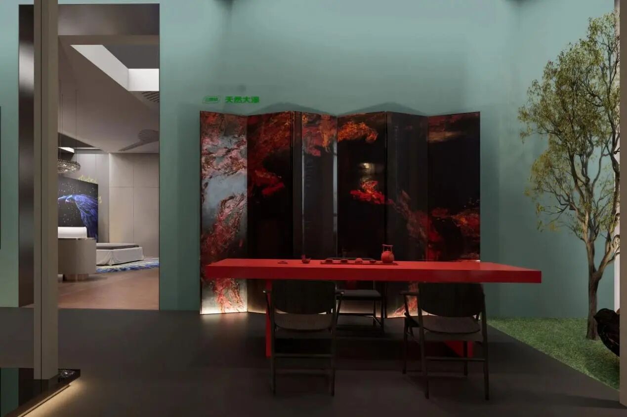 “序|歸心之路”以山石肌理墻面與光影敘事墻開篇,瞬間隔絕展會喧囂;“綠野之庭”的草垛座椅區成為設計師交流聚集地;“漆閣”中傳統大漆與螺鈿家具的搭配,配合苔蘚間浮動的月影光球,喚起無數觀者對家族記憶的共鳴。而“土之間”“水廳”的空間格局,更將自然肌理與情感表達融入細節,讓“親愛”的多元內涵轉化為可觸摸的人居體驗。