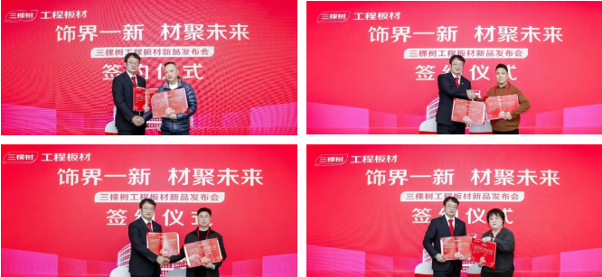 發布會最后,現場舉行了隆重的簽約儀式。眾多意向客戶對三棵樹工程板材的產品力與戰略方向表達了高度認可,紛紛現場簽約,達成深度戰略合作。