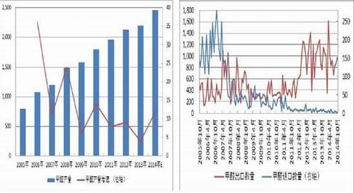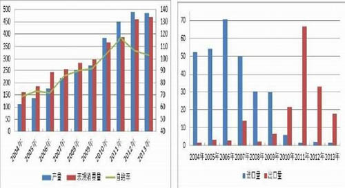 圖 8:2004-2013 年醋酸產量和消費量情況單位:萬噸圖 9:2004-2014 年醋酸進出口情況單位:萬噸