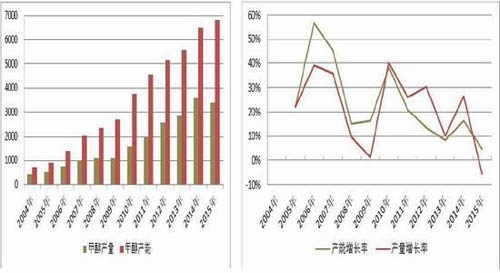 從 2004 年以來我國甲醇產能持續快速擴張,2004 年我國甲醇年產能 732 萬噸/年,截至 2014 年年底我國甲醇有效產能約為 6500 萬噸/年,甲醇產能增長率約為 16%。同時根據歷年數據測算,預計明年甲醇產能或將持續增加,但產能增長率可能會有所放緩,2015 年我國甲醇產能約為 3397 萬噸/年;截至到 2014 年年底我國甲醇產量大約為 3600 萬噸,產量增長率約為 26.3%,產量增速相較于產能增速較為明顯。由于過去十年間甲醇行業的快速發展,甲醇產能局部已經嚴重過剩,加之我國經濟增速放緩,甲醇傳統下游需求下降,預計未來一段時間我國甲醇產能和產量或將雙雙放緩。在今后 3—5 年時間里國內甲醇生產商和貿易商將要著力解決去產能化及尋找新的需求點,以此來改善甲醇供求矛盾突出的局面。