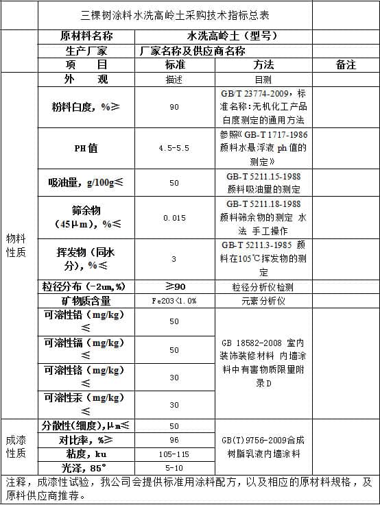 三棵樹涂料水洗高嶺土類采購技術指標